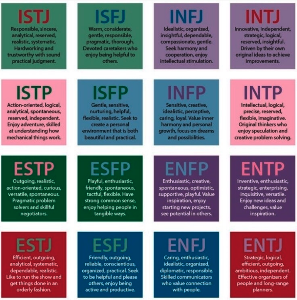 : INFP, ENFP, ESFJ, ISFJ, ESFP, INTP, INFJ, ENFJ, ENTP, ESTJ, ISTJ, INTJ, ISTP, ESTP, ENTJ