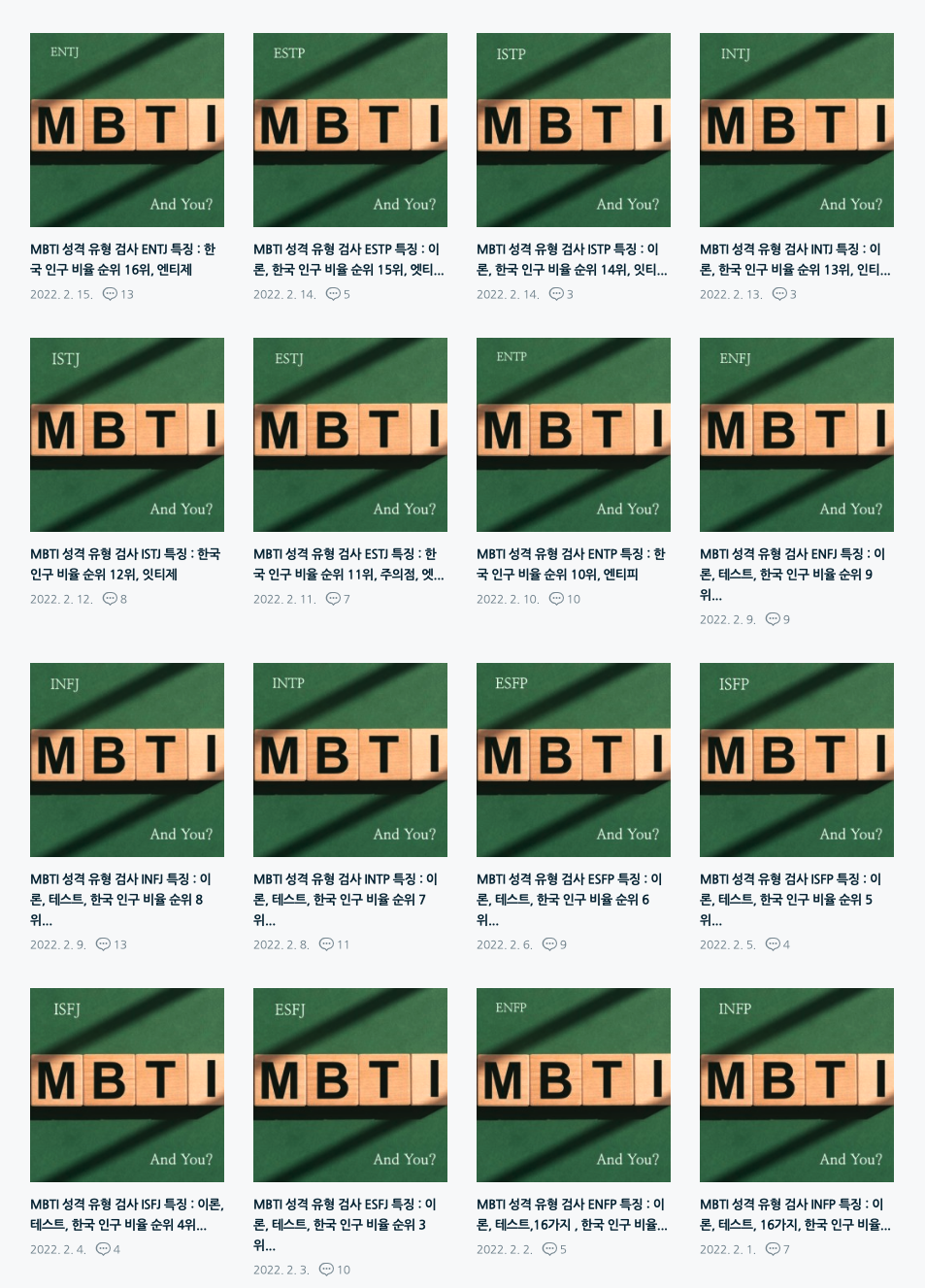 다른 다양한 MBTI 검사들이 생겨나고 있는 상황이기에 MBTI 검사/테스트는 잘못된 결과를 제공할 수 있습니다.